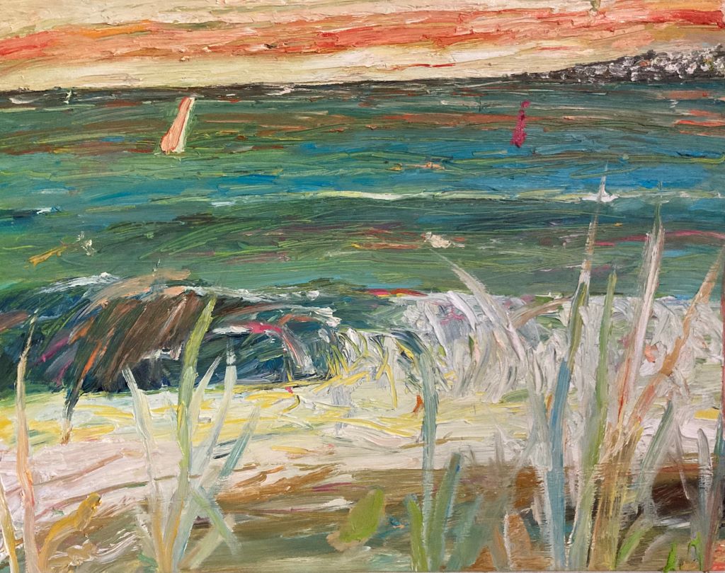 Das Meer erscheint mal ruhig und friedlich, mal aufgewühlt in wildem Rot. Da tanzen fröhliche Olivenbäume, dort dräut der Saharasand. Vor schwarzgrauem Regenhimmel suchen die Menschen unter farbenfrohen Regenschirmen Schutz. Dann wieder sinnliche Figuren in exotischen Gärten, Hund und Katze, die frei herumlaufen und in den nächsten Bildern gespenstische Landschaften und schattenhafte Betrachter.