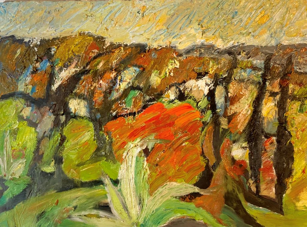 Auch die Farben schichten sich im kraftvollen Malstil von Jane Kleinschmit. Es entstehen reliefartige, plastische Bilder, die die Betrachter dazu verlocken könnten, hineinzugreifen.